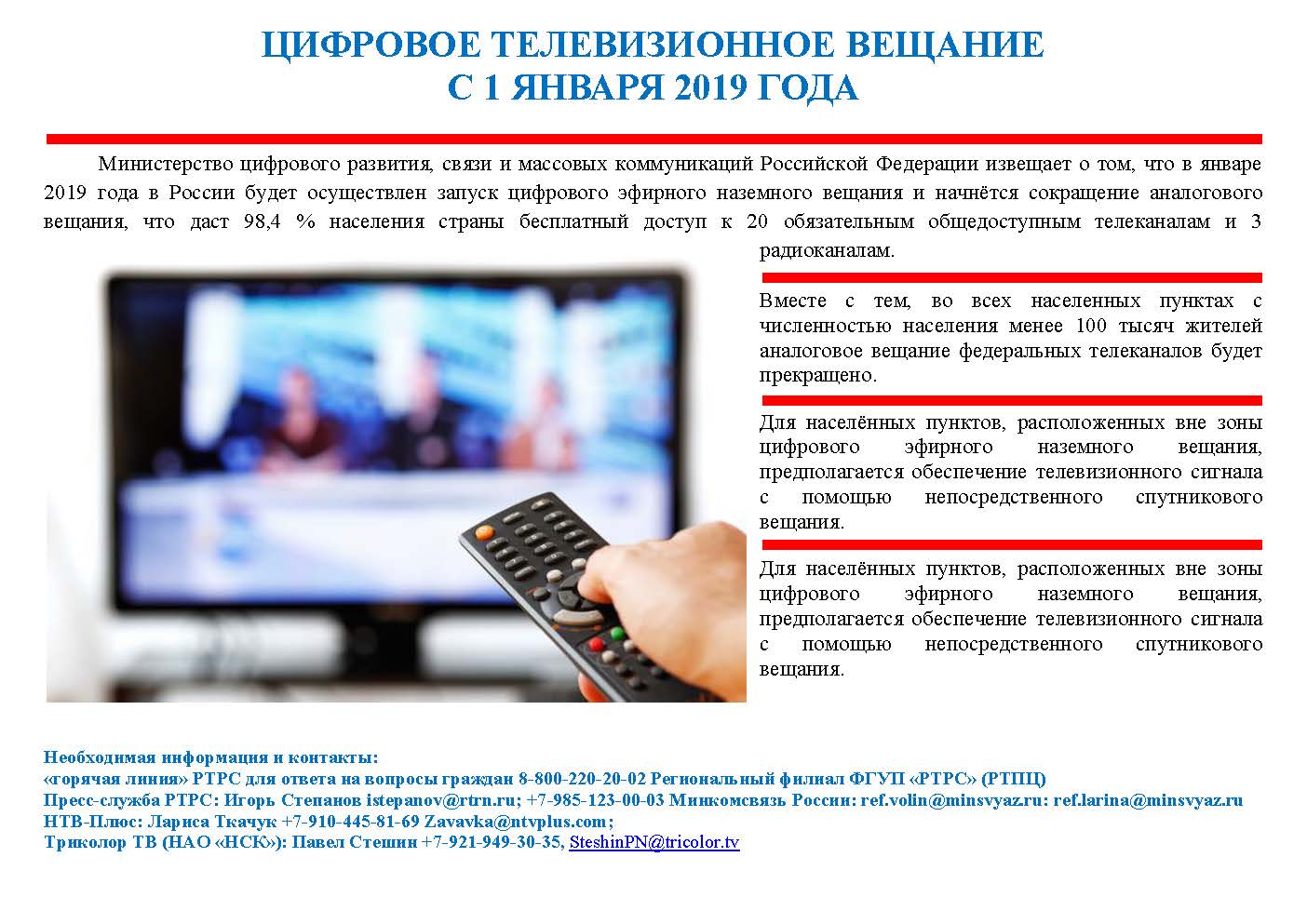 25.12.2018Министерство цифрового развития, связи и массовых коммуникаций Российской Федерации извещает о том, что в январе 2019 года в России будет осуществлен запуск цифрового эфирного наземного вещания и начнётся сокращение аналогового вещания, что даст 98,4 % населения страны бесплатный доступ к 20 обязательным общедоступным телеканалам и 3 радиоканалам.